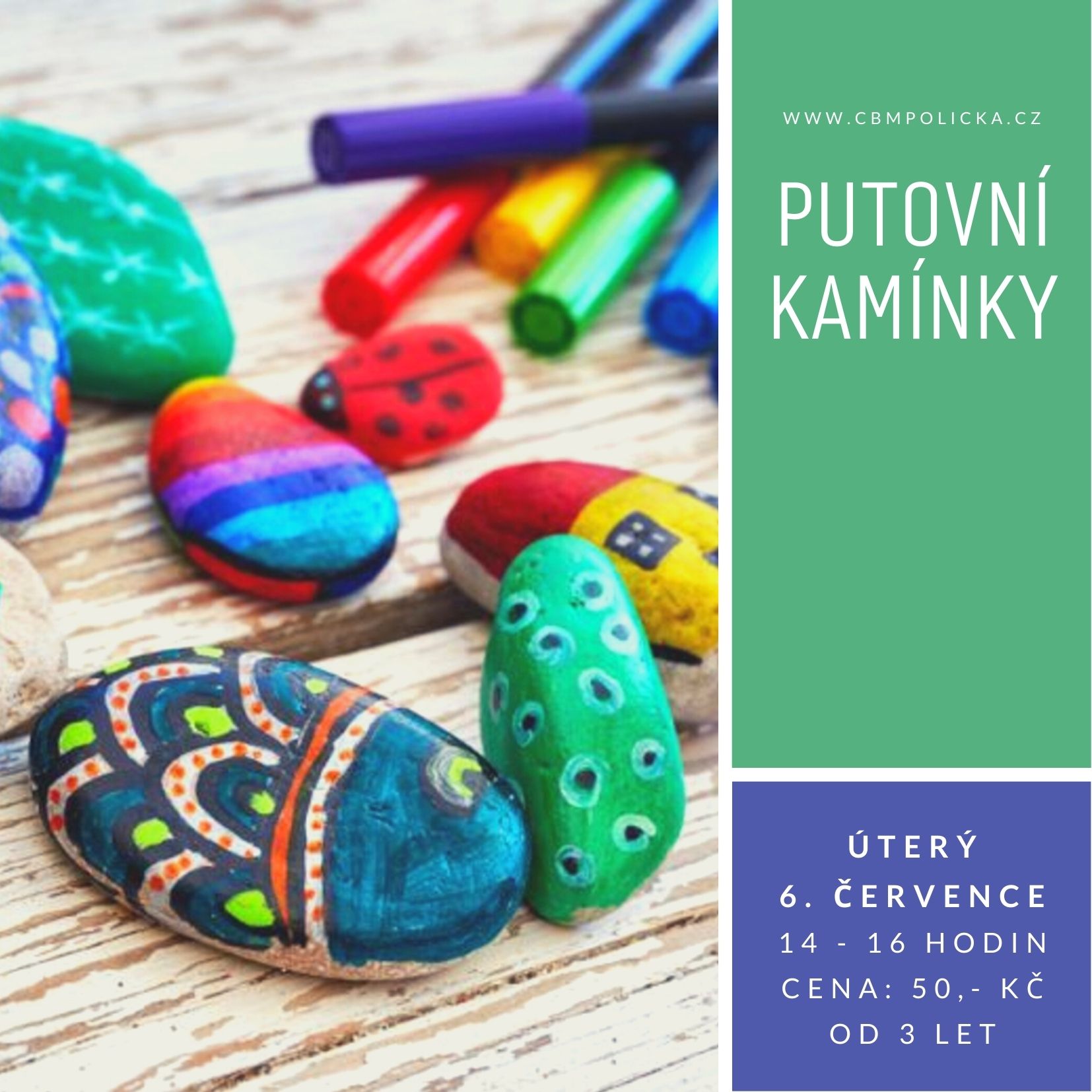 PUTOVNÍ KAMÍNKY – fenoménem posledních let se stalo malování kamínků všech velikostí a tvarů. Chystáte se namalovat svůj první kamínek? Není to nic složitého, ale jestli si nevíte rady, jak začít, pomůžeme vám! Kamínek pak můžete nechat na nějakém speciálním místě na vašich prázdninových toulkách. Cena: 50,-Kč za výtvarné pomůcky a materiály. Dílna pro děti od 3 let.