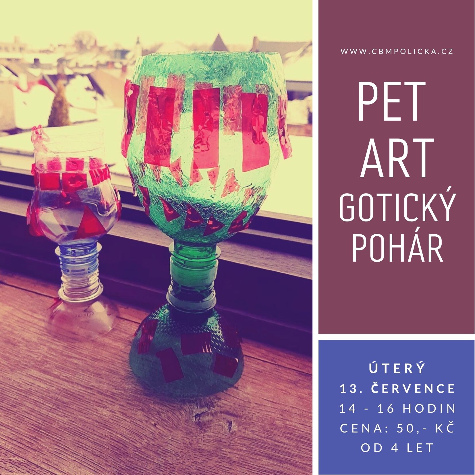 PET ART gotický pohár – vyzkoušíte si výtvarnou techniku, kterou zvládnou i ti nejmenší. Z obyčejné PET láhve se dá vyrobit rozmanitá škála dekorací. Nevěříte? Rádi vás o tom přesvědčíme! Obyčejná láhev, kterou bychom jinak dali do odpadu, může pod našima rukama zázračně proměnit. Cena: 50,-Kč za osobu za výtvarné pomůcky, materiály a návštěvu výstavy ŽIŽKA PŘED BRANAMI. Vhodné pro děti od 4 let.