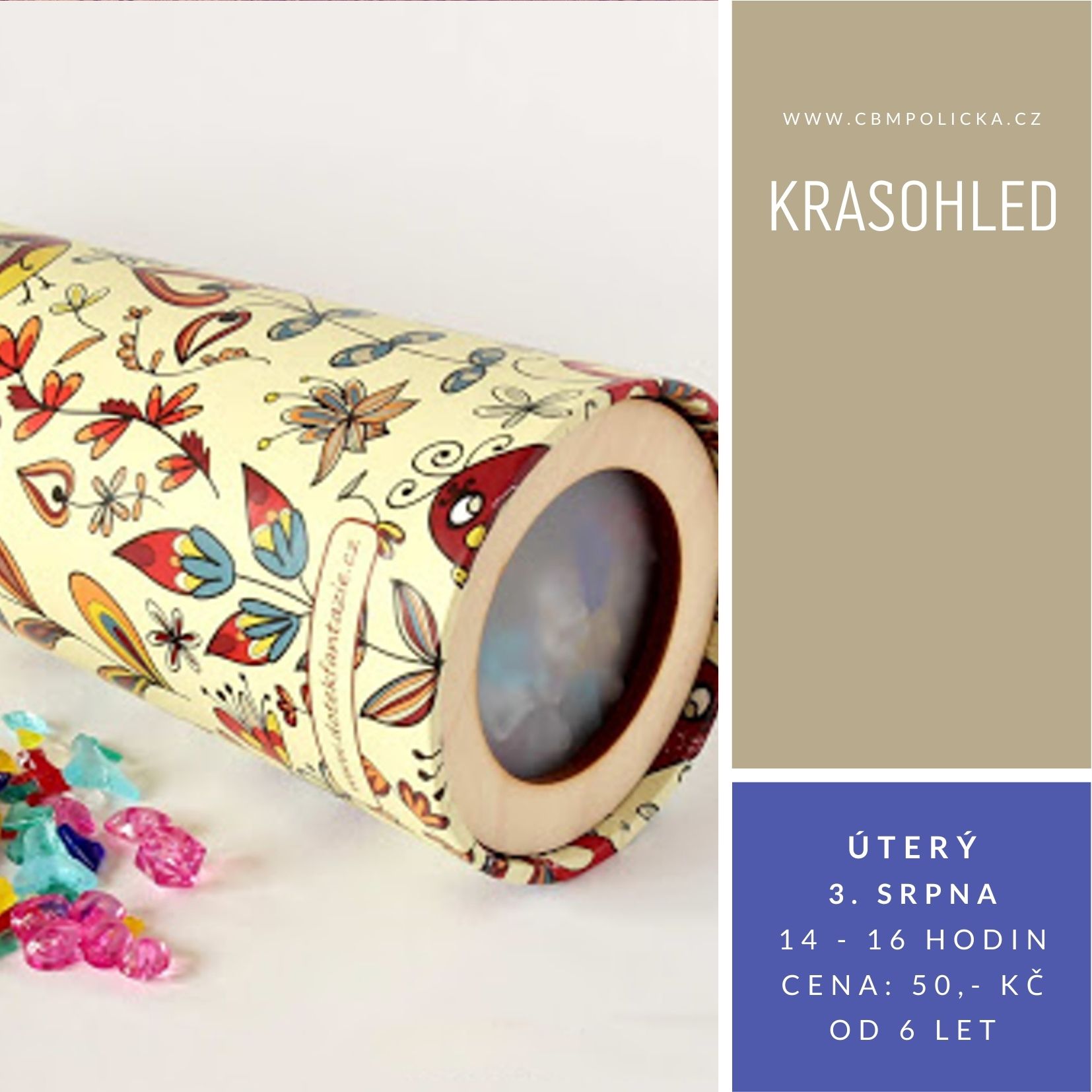 KRASOHLED – nechte rozehrát barevné střepy, sklíčka a korálky a přijďte si vyrobit barevný krasohled, ve kterém se vám při pohledu proti světlu roztančí neopakovatelné obrazce. Cena: 50,-Kč za výtvarné pomůcky a materiály. Dílna pro děti od 6 let.