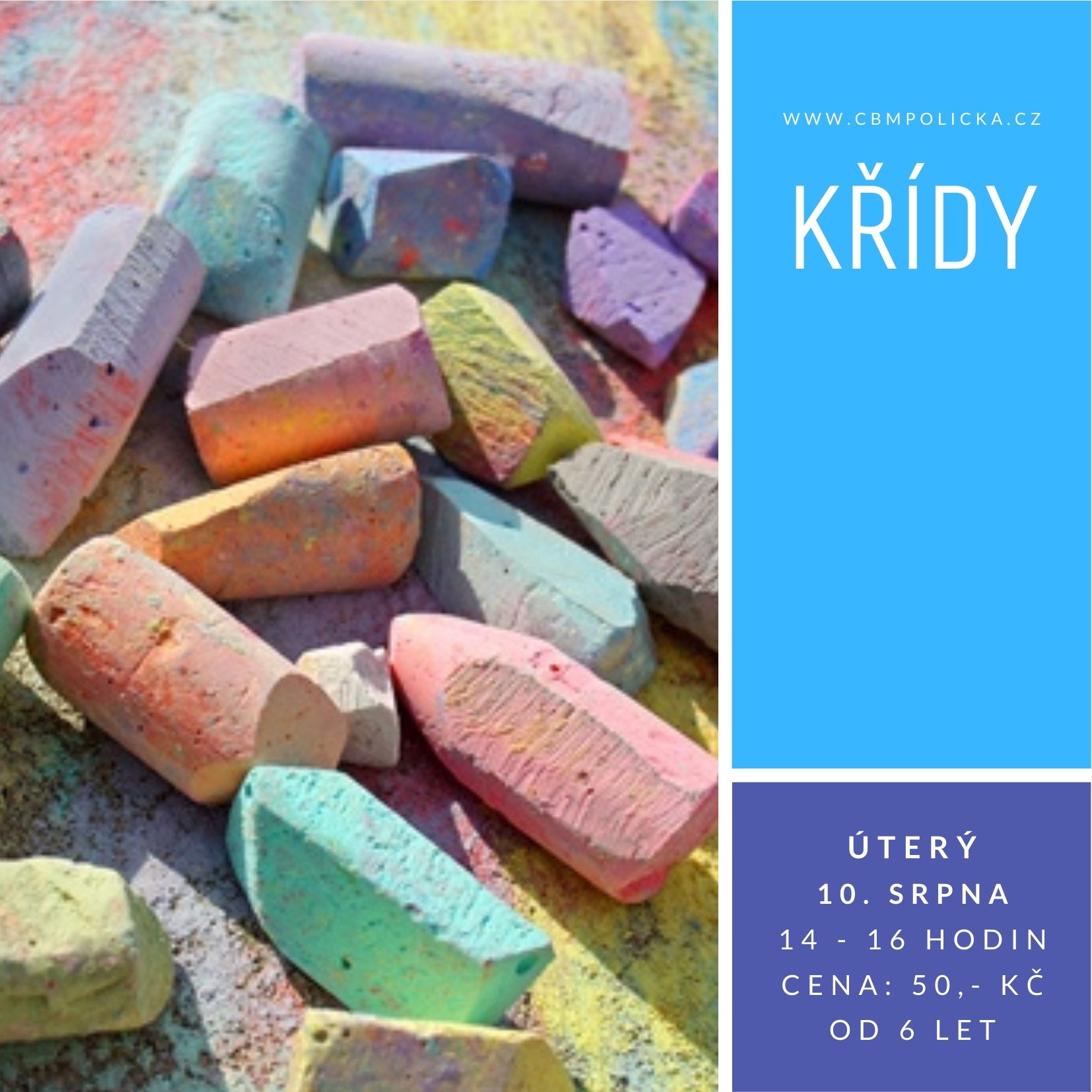 KŘÍDY – kreslení děti baví v každém věku. Ať už máte doma předškoláka nebo dítko školou povinné, dejte mu do ruky křídu, ukažte volné místo pro jeho kreativitu a rázem bude všude plno barevných obrázků a kreseb! A děti hlavně velice rády něco vyrábějí – tak proč ne zrovna domácí křídu? Cena: 50,-Kč/ks barevných kříd. Dílna pro děti od 6 let.