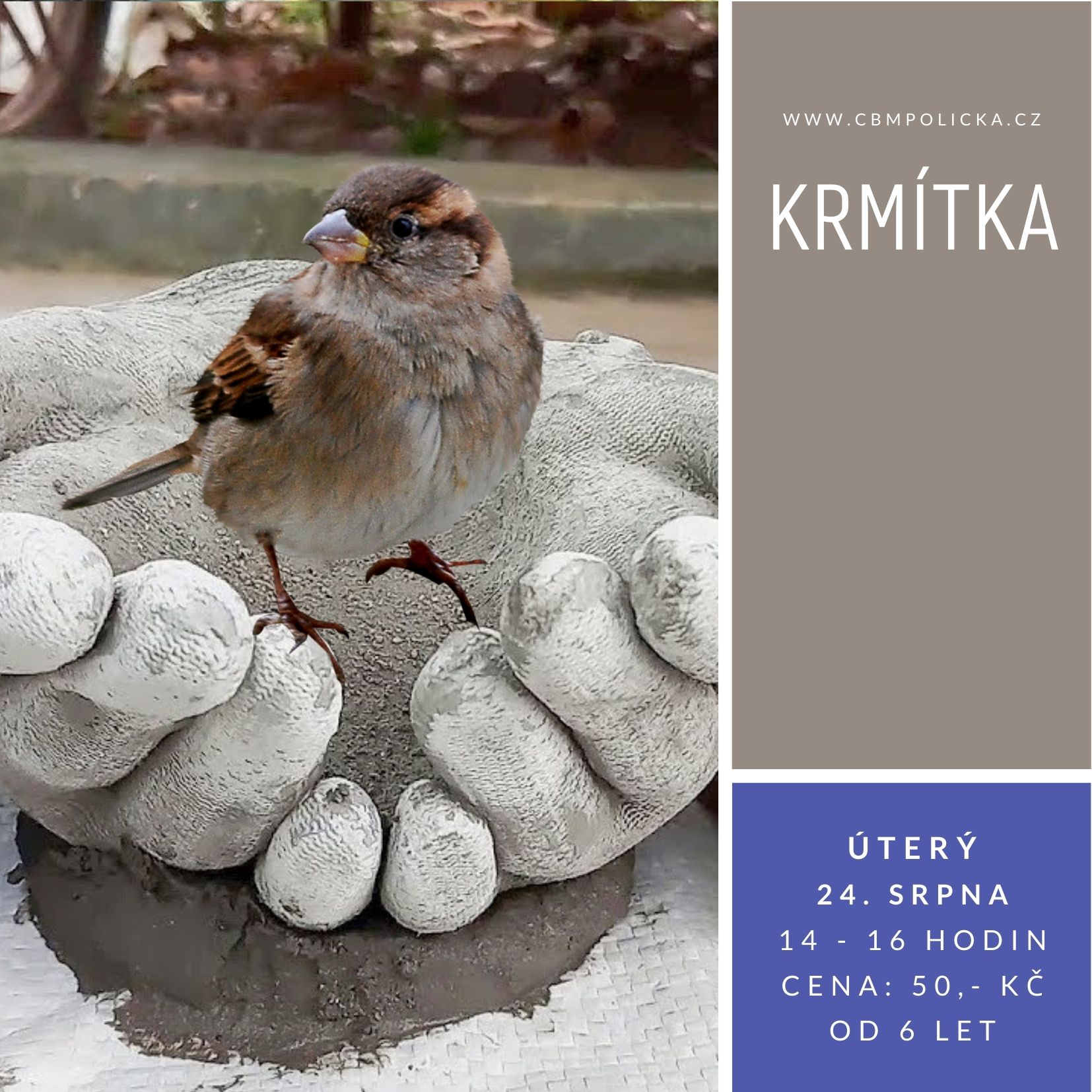 KRMÍTKA – chtěli byste nasypat ptáčkům venku trochu něčeho dobrého, ale nemáte krmítko? Není nic snazšího, než si ho u nás udělat. Malé děti si vyrobí a ozdobí závěsné krmítko ze sklenice. Pro starší bude připraven, v posledních letech čím dál více oblíbený, beton, z něhož vytvoří krmítko na zahradu či parapet. Cena: 50,-Kč za materiál. Dílna pro děti od 6 let.
