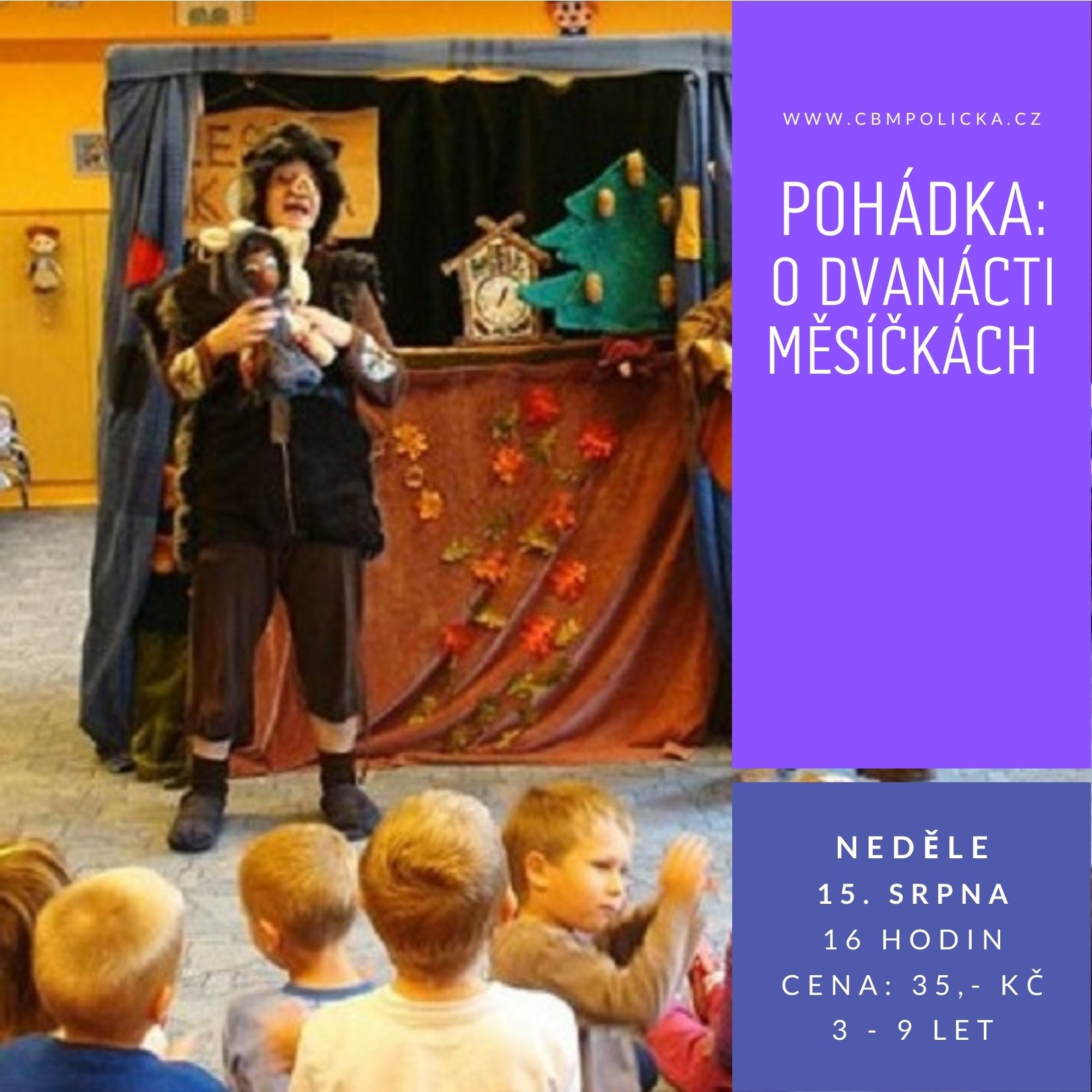 O DVANÁCTI MĚSÍČKÁCH – trochu zimní atmosféry přinese pohádka o Marušce, kterou zlá macecha s Holenou do mrazu vyženou. Zmrzne v lese? Nebojte se… ohřeje se. Dvanáct kouzelných bratrů dobře ví, kdo si pomoc zaslouží. A macecha s Holenou? Na chamtivost dojedou! Účinkuje Divadlo JÓJO. Vstupné: 35,- Kč. Délka představení 35 min. Vhodné pro děti ve věku 3 – 9let.